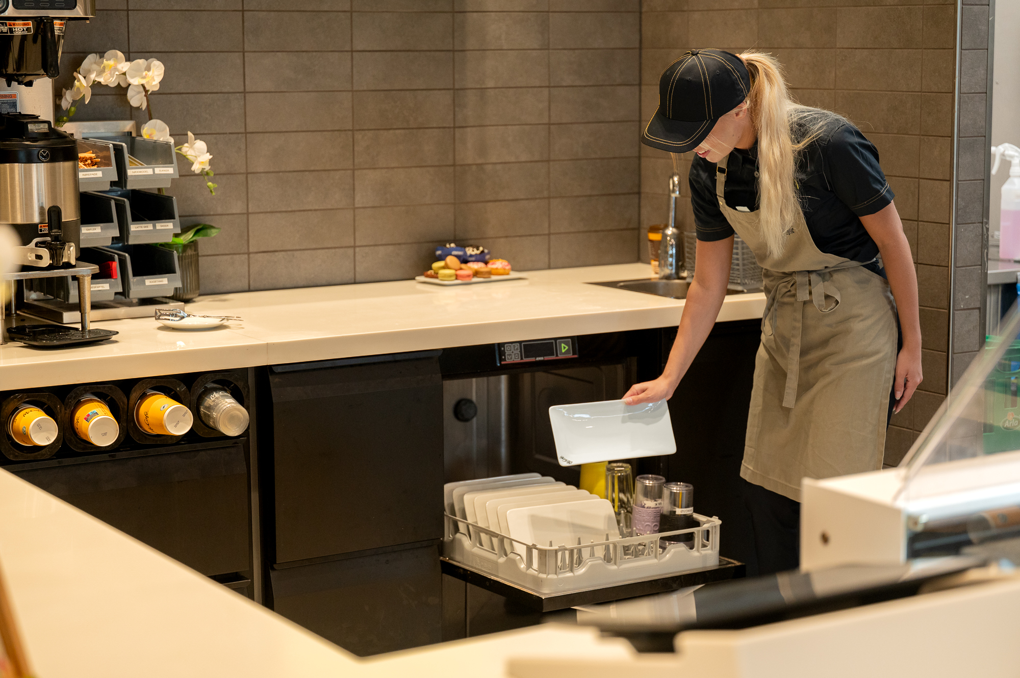 The JEROS under-counter dishwasher, Model 955, combines high performance with low noise and a sleek black design. It takes up minimal space while delivering maximum results - and that’s why it’s the trusted model used in every McCafé at McDonald’s locations across Denmark.