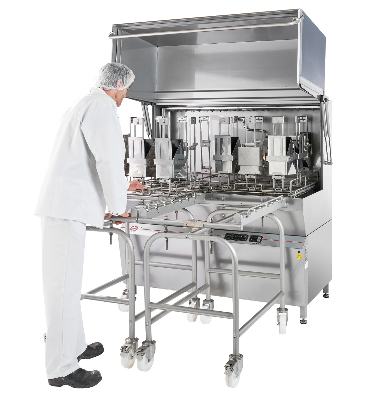 - A specially designed trolley for transporting the holders with the attached weighing bowls from the multi-head weighers to the dishwasher. Here, the holder with the weighing bowls is pushed into the dishwasher.