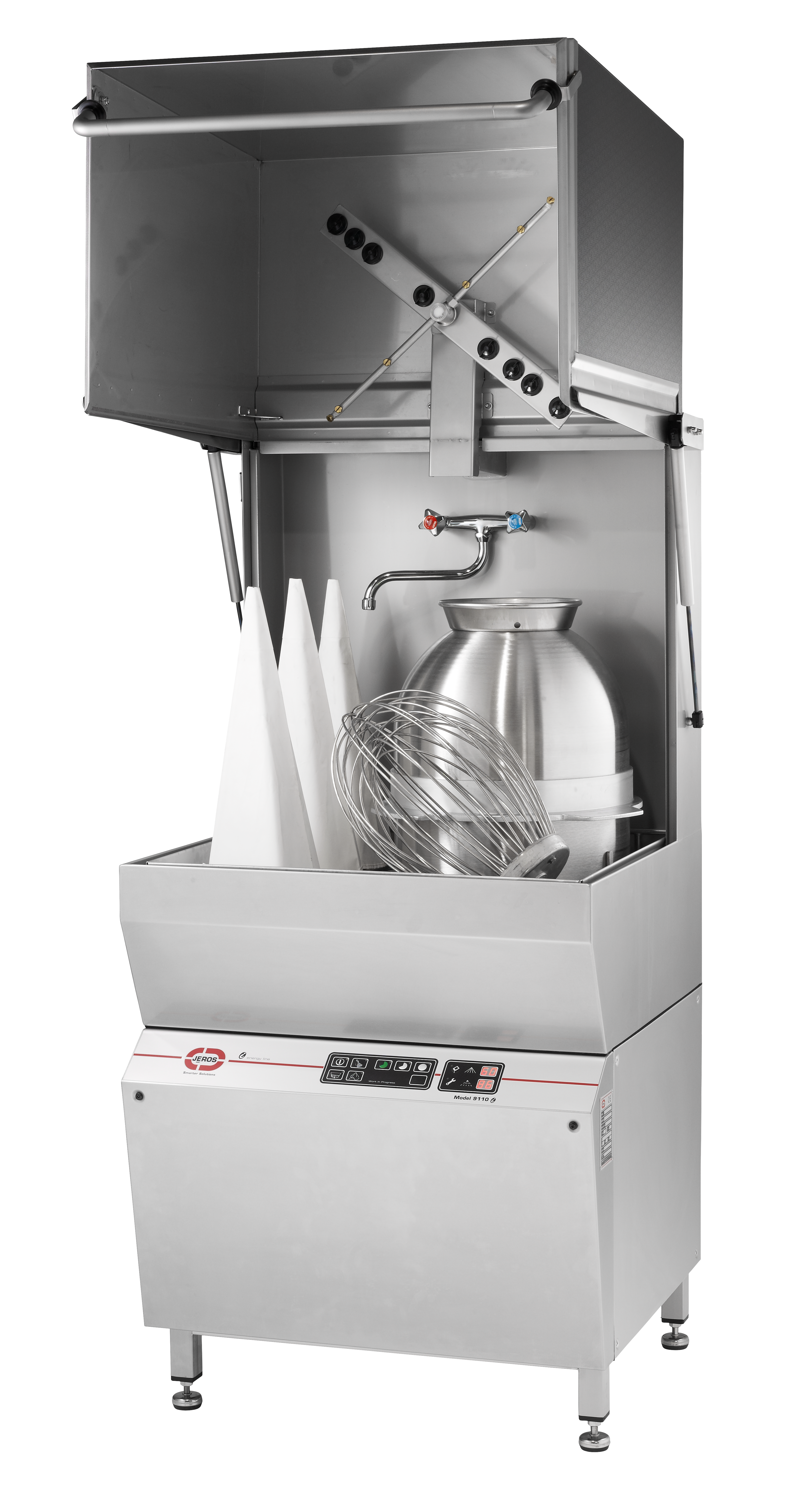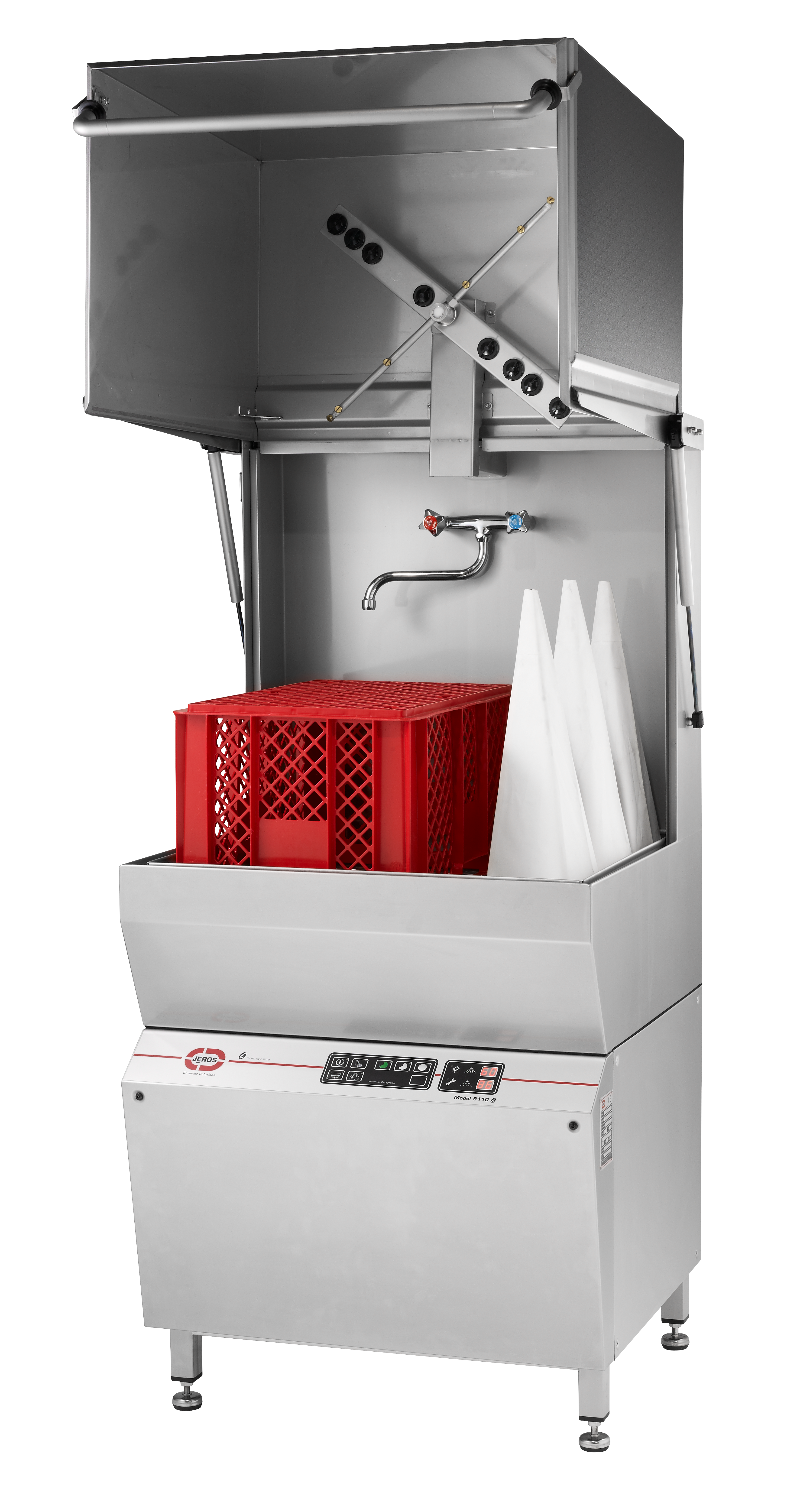 The Model 9110 commercial dishwasher from JEROS delivers powerful, hygienic cleaning in a compact design built for fast-paced kitchens and food service environments.